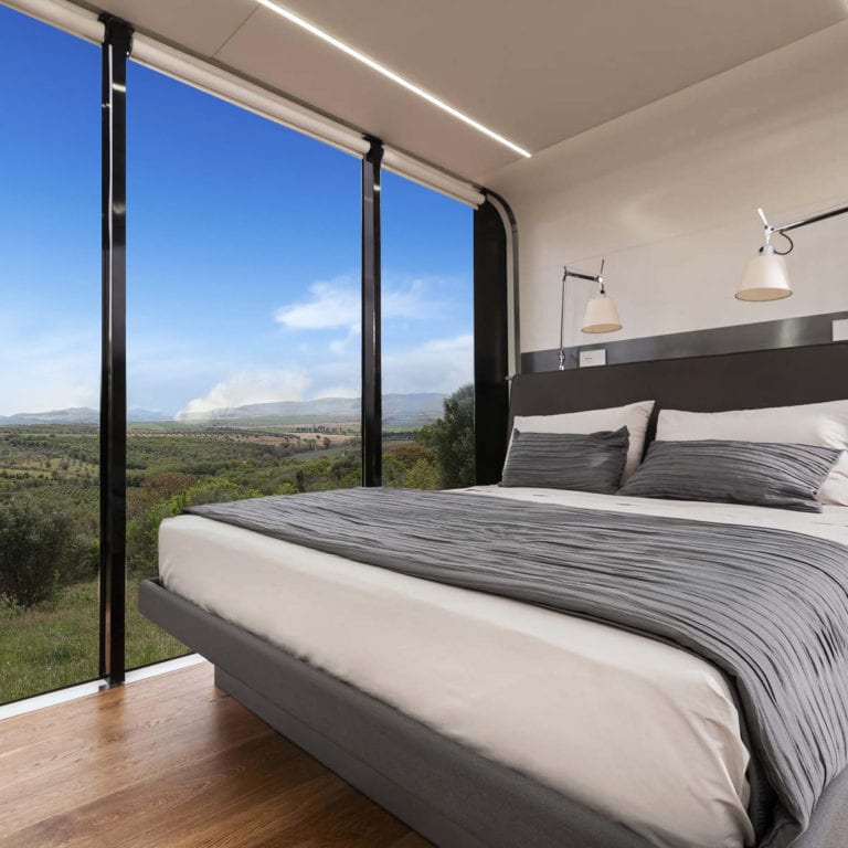The Defender Eco Home has a minimal design that reflects the “green” values of Land Rover. The building is completely self sufficient thanks to solar panels on the roof, and is made of sustainable materials; polycarbonate panels for the external cladding, recycled fibre-glass, eco-leather and natural fibres for the furnishings, finishes that recycle waste materials from wine production, ceilings finished with a purifying material to reduce pollution. The transparent walls on two sides enable visitors to emerge themselves in the unspoilt and natural surroundings of the Eco Home location.
